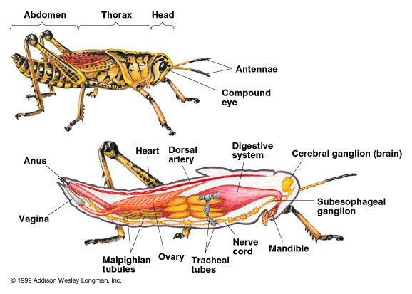 - Head, thorax, abdomen, 6 - 8 legs, antennae (most)