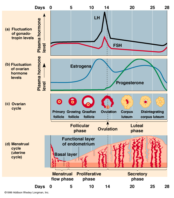 - Luteal phase: LH causes corpus luteum to secrete Estrogen +