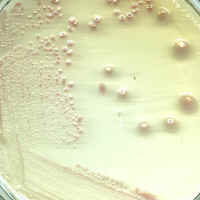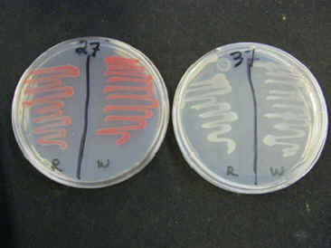Serratia are Gram-negative rods belonging to the Enterobacteria. They are common to soil, water, and mammals. S. marcescens is an opportunistic pathogen in humans and is easily recognized by its large, red-pigmented colonies when grown at less than 35C. At 37C, however, the genes for making the red pigment prodigiosin are turned off.