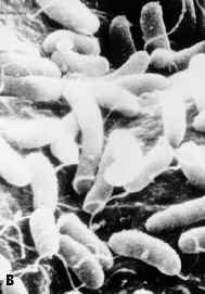 Vibrio is a Gram-negative curved bacterium that is closely related to the Enterobacteria. It includes several serious pathogens, including the strain that causes cholera (V. cholerae). A toxin produced by these bacteria (Cholera Toxin) activates G-proteins in the host's intestinal epithelium, causing these cells to secrete massive amounts of water. The resulting diarrhea causes dehydration. Some strains of Vibrio are luminescent (V. fischeri).