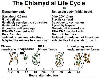Chlamydias are Gram-negative rods that are among the smallest bacteria known (as small as 0.2 mm). They are chemoheterotrophs with an obligate intracellular life cycle. Some strains of this pathogen can be sexually transmitted. Chlamydia cause diseases such as urethritis, psittacosis, trachoma, and pneumonia