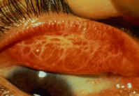 Trachoma is a chronic eye infection that causes scarring of the conjunctivae, corneal abrasion and scarring, and possible blindness. It is caused by serotypes A, B and C of Chlamydia trachomatis. Inflammation of the conjunctivae leads to the inward-turning of eyelids and eyelashes to rub against the cornea. Acute conjunctivitis (adult and neonatal) is caused by serotypes A, B, and D - K, involves pus-filled discharge and can lead to keratitis.