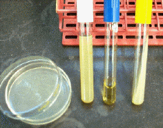 Culture media that are liquid are known as broths (C). With the addition of agar (a polysaccharide made by some algae), culture media can be made to solidify. When heated to 80°C, agar solutions are liquid, but will gel when cooled to below 40°C. Liquid agar media can be poured into Petri dishes or test tubes to harden there. In this way, one can produce agar plates (A), agar slants (D; agar hardens in a test tube at an angle), and agar deeps (B; the tube is mostly filled with solidified agar). Agar plates are usually used for isolating pure cultures of bacteria and for observing colony characteristics. However, the large surface area makes them more susceptible to contamination and to drying out. Agar slants are an excellent means for keeping a pure culture for several months. A smaller surface area and a much smaller opening keep moisture in and contaminants out. For longer-term cultures, agar deeps can be used. Deeps are stab-inoculated with an inoculating needle (see Ch. 3). Bacteria can last months to a year or more. Broths, in contrast, allow for very rapid growth of bacteria, but nutrients are quickly depleted and wastes accumulate. Broths are most often used to grow up large numbers of bacteria quickly.