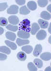 - Multiple ring-shaped trophozoites, banana-shaped gametocyte, normal size RBC